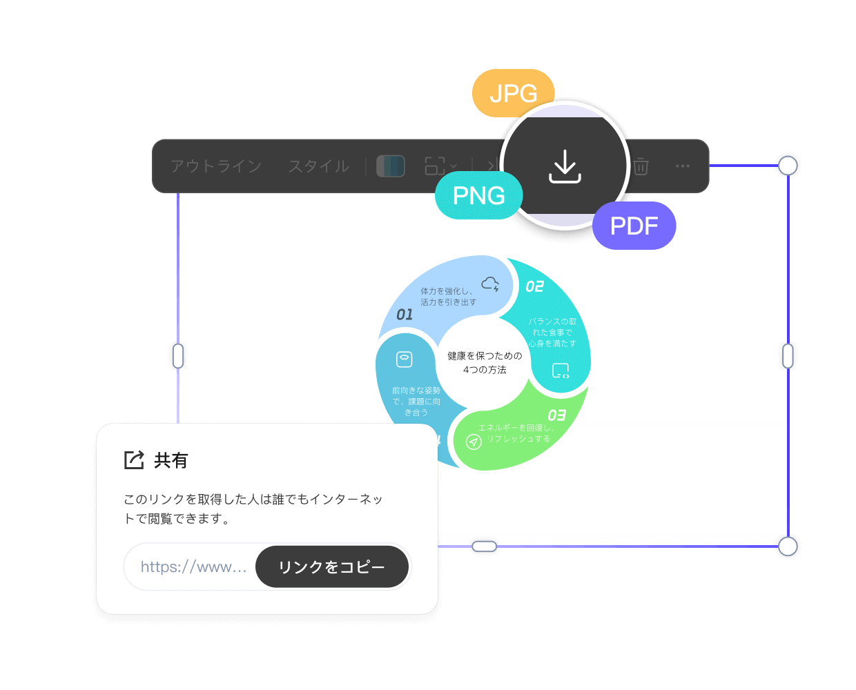 Genera diagrammi ciclici a partire dal testo in pochi secondi grazie all'IA. Scegli tra template eleganti, modifica i colori e i passaggi e esporta come PNG, JPG, PPT o PDF. Ideale per visualizzare i flussi ciclici e migliorare l'efficienza del processo.